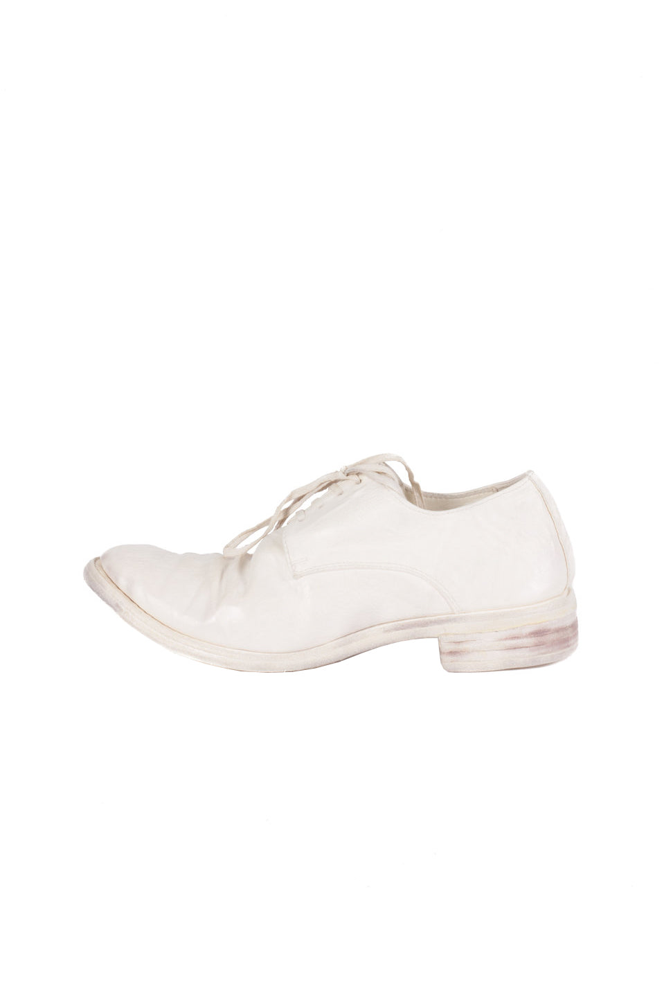 The AM/2600L model Object Dyed Goodyear Derby embodies Carol Christian Poell's vision of utilising artisanal craftsmanship to create avant-garde pieces. This shoe is crafted from ROOMS-PTC in 100% kangaroo leather, in white (Colour: 01).