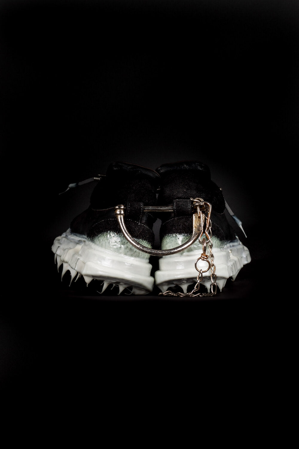 Elasticated laces provide a secure and adaptable fit, enhancing the functional aspects of the design without compromising its sleek profile. The inclusion of a handle detail reiterates the sneaker's unique identity, offering an unconventional way to carry and present the footwear.