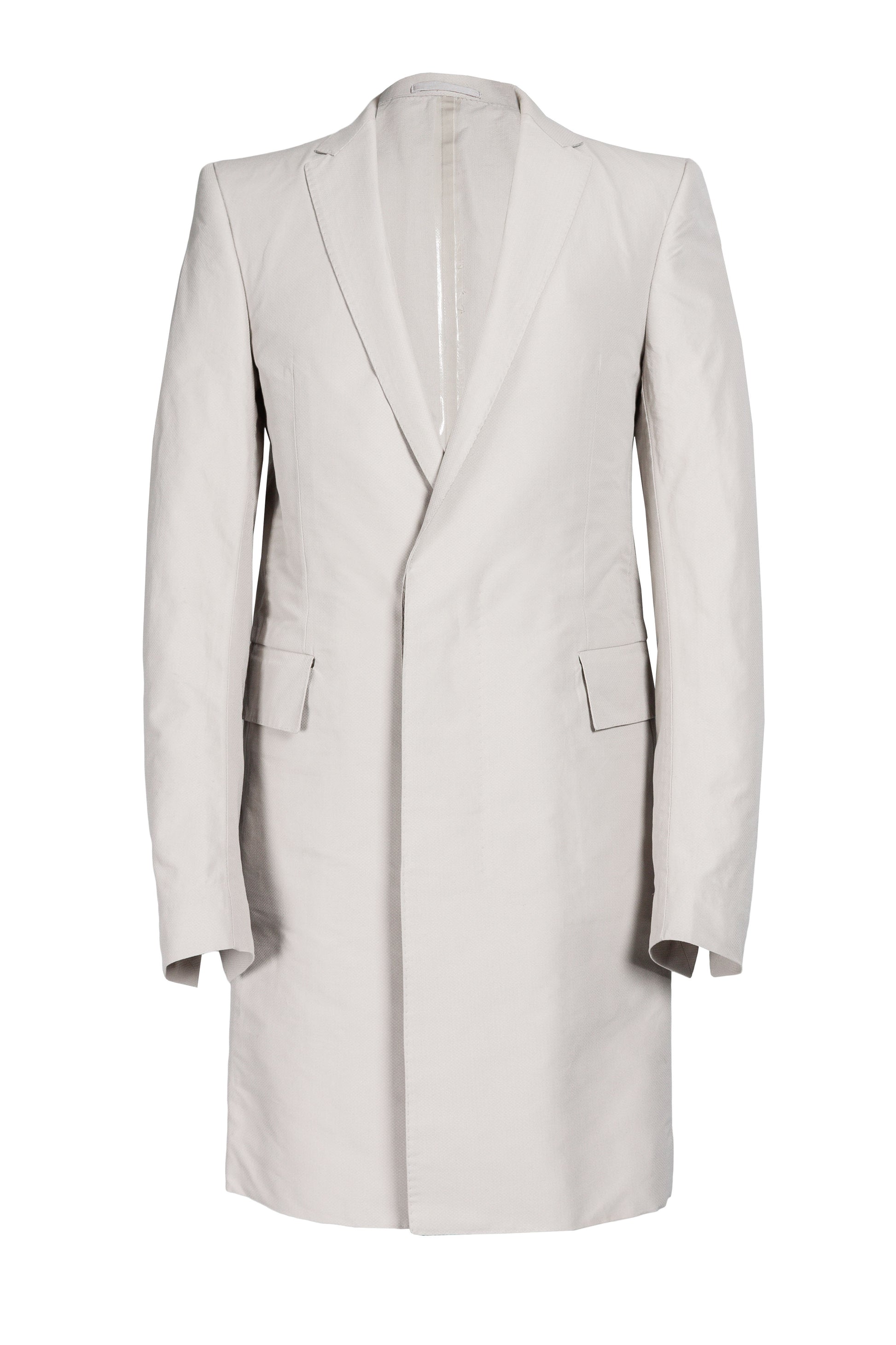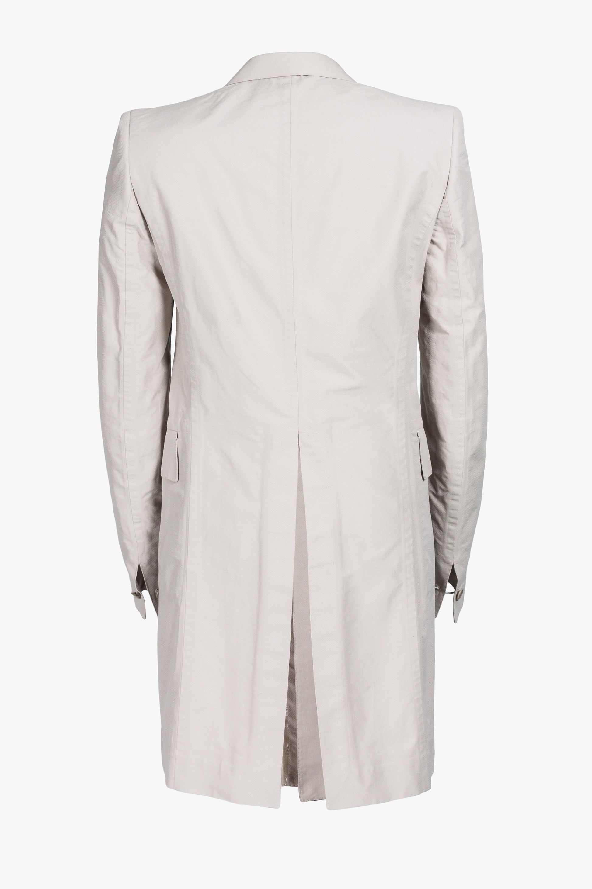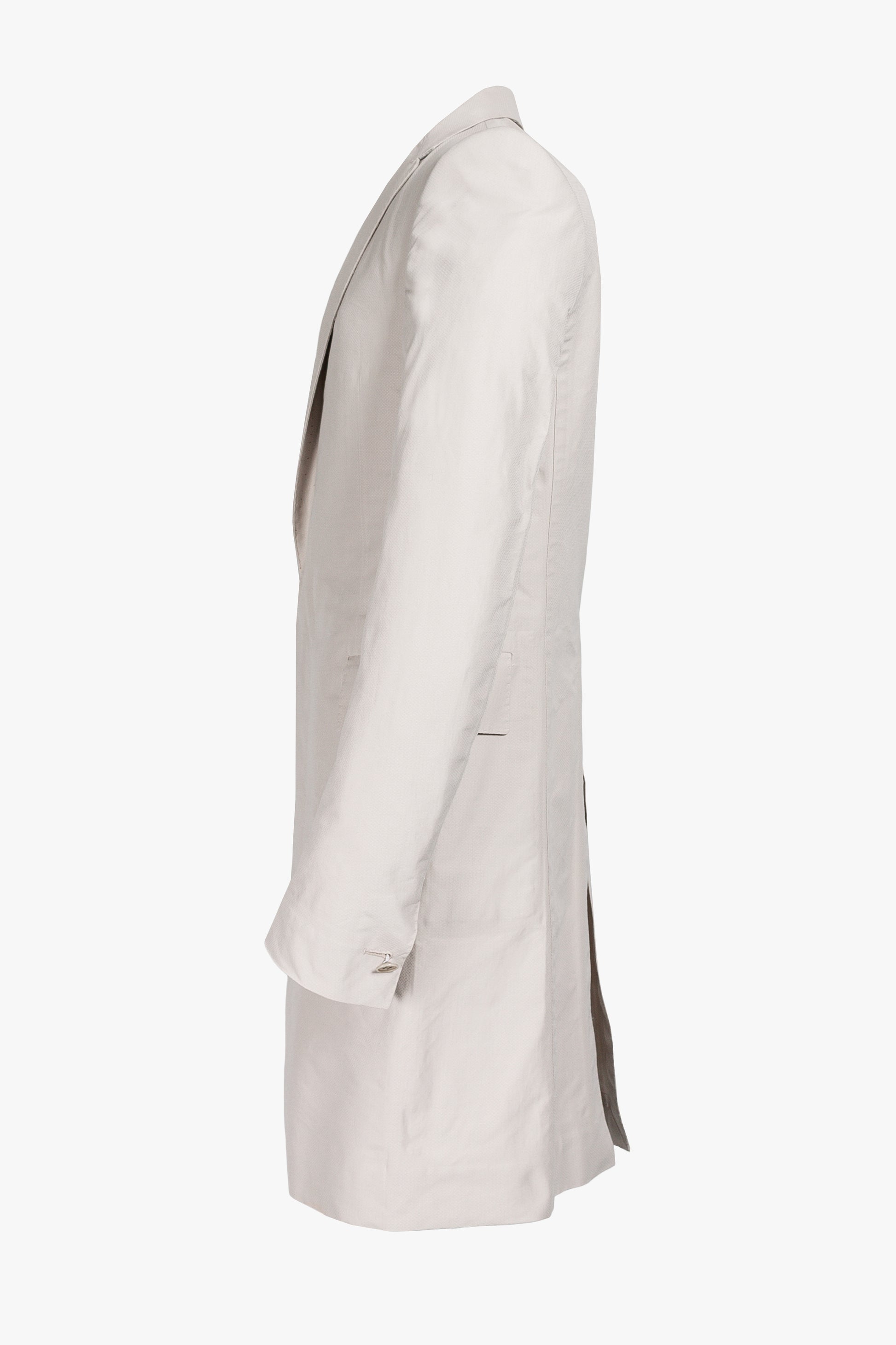 The Jacketchute-Lined 2 Button Taped Long Jacket, model GM/2385, redefines outerwear with its unconventional engineering. Crafted entirely from TWEEN, a 100% cotton fabric, this grey jacket embodies Carol Christian Poell's innovative processes. It features a jacketchute lining, signature taped seams, and a classic two-button closure. The long silhouette and high back vent accentuates the moulded feel of this tailored jacket.