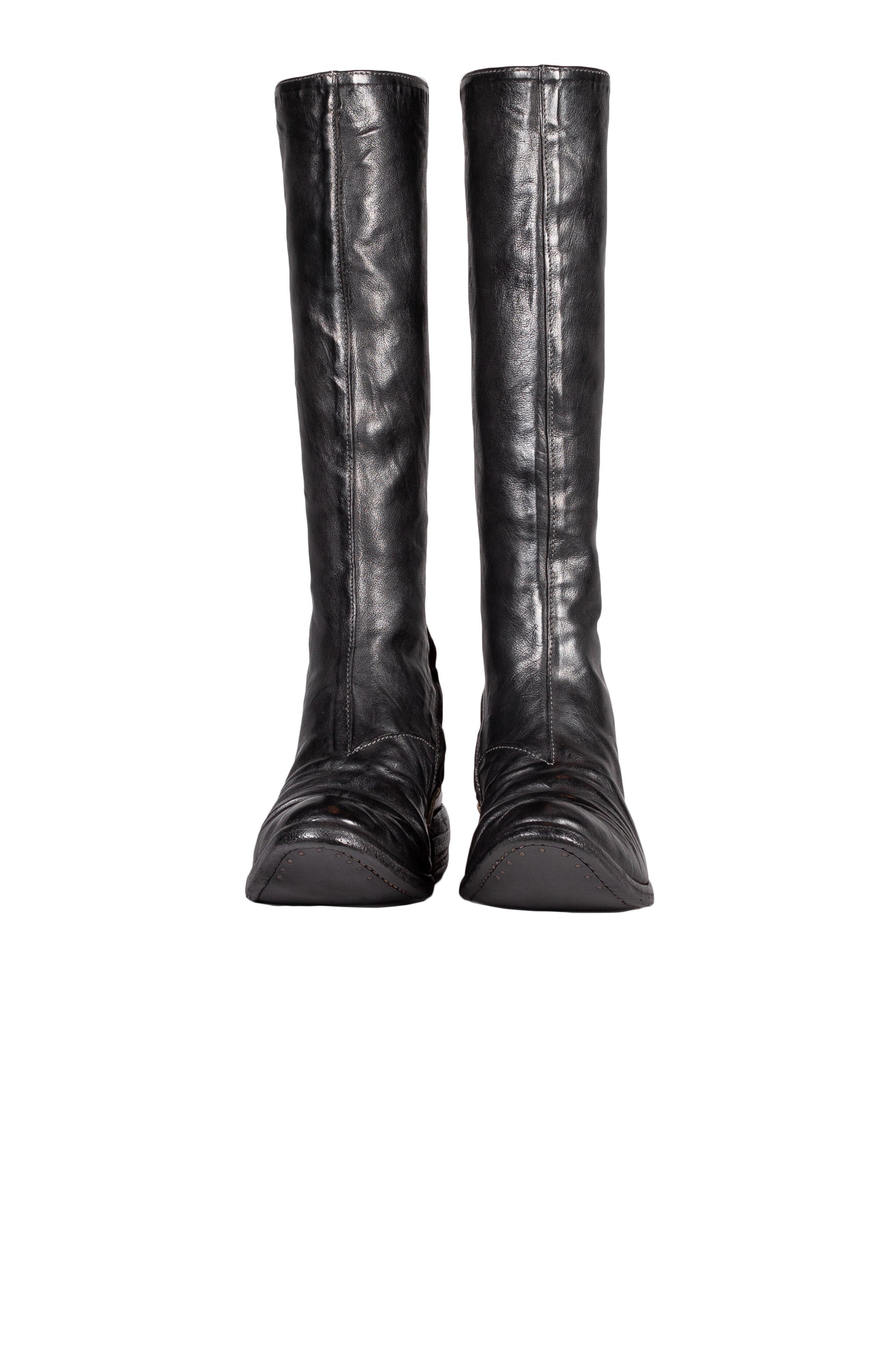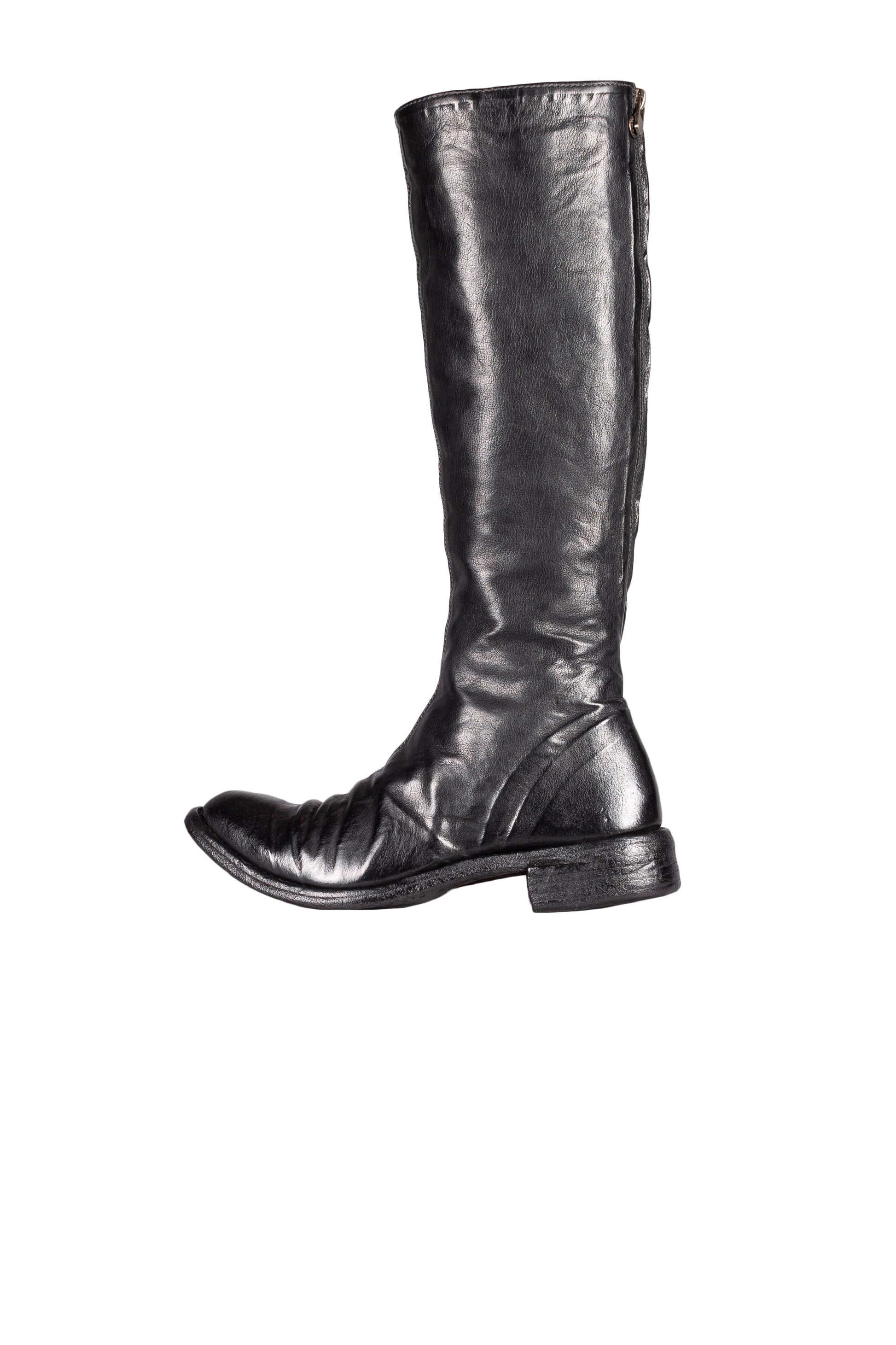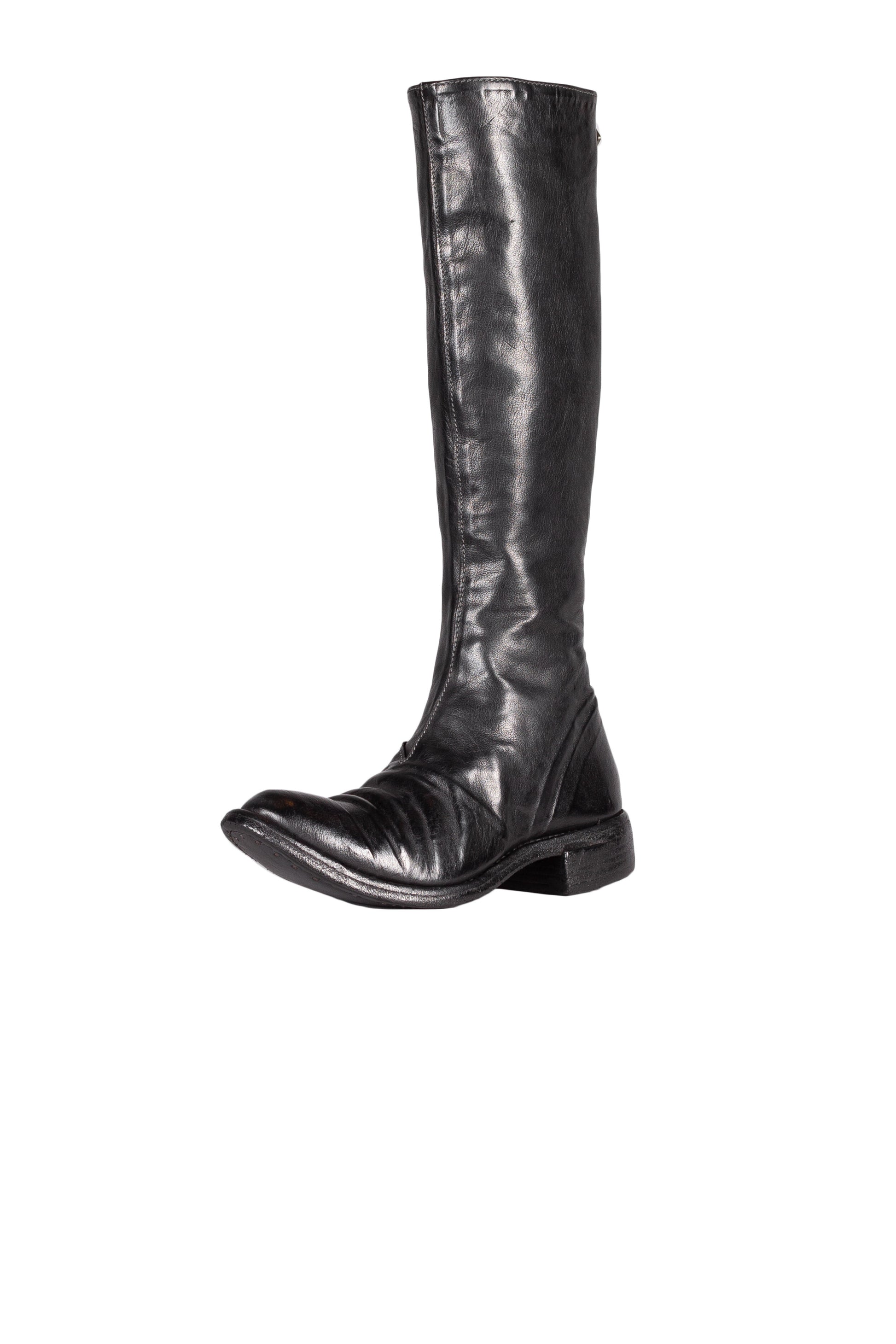 The Model: AF/0991L Object Dyed Lined Diagonal Zip Knee High Goodyear Boot represents Carol Christian Poell's distinctive fusion of the avant-garde with artisanal craftsmanship. Crafted in ROOMS-PTC, the knee length boot is constructed from 100% kangaroo leather, which is esteemed for its lightweight feel.