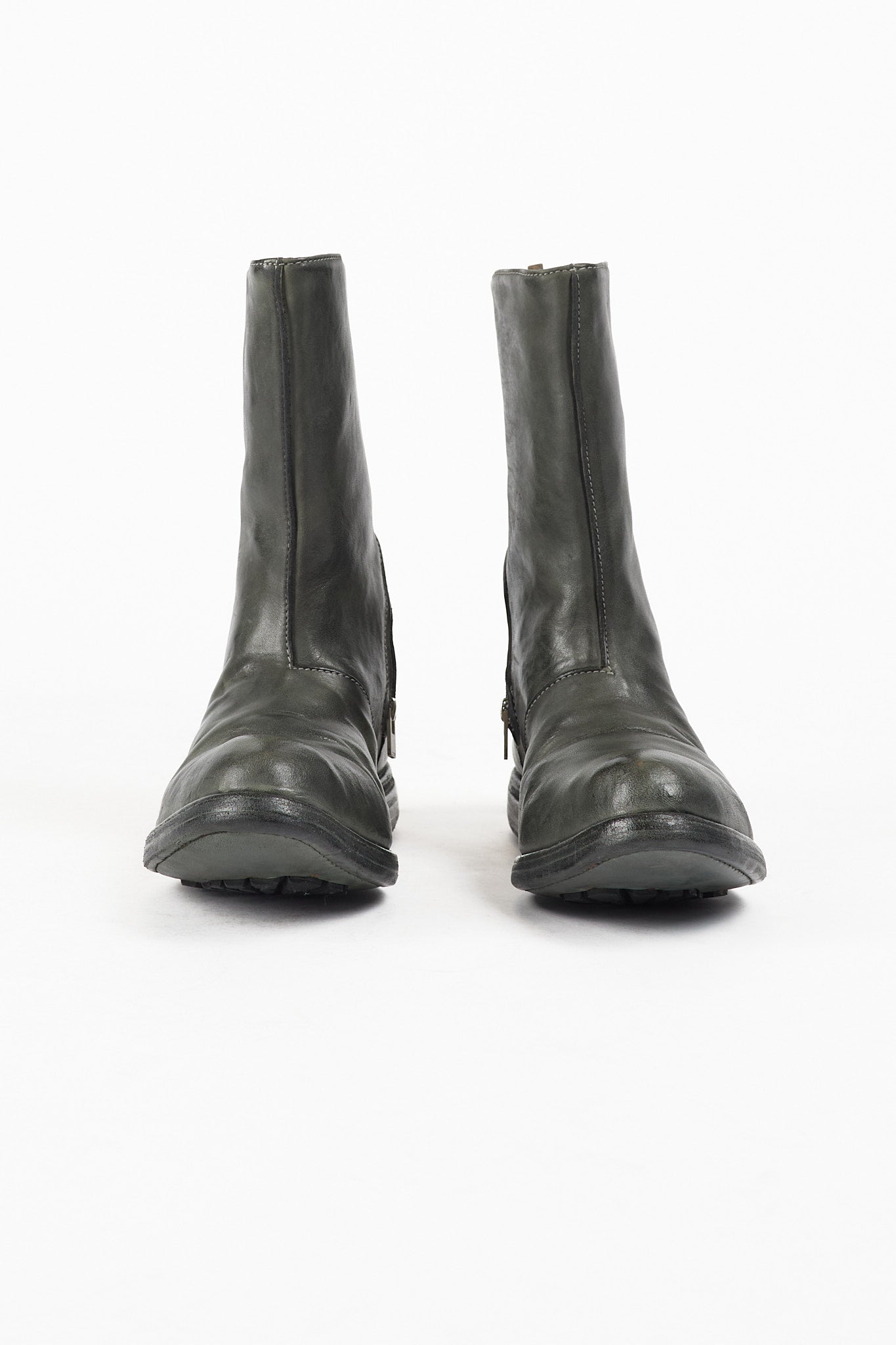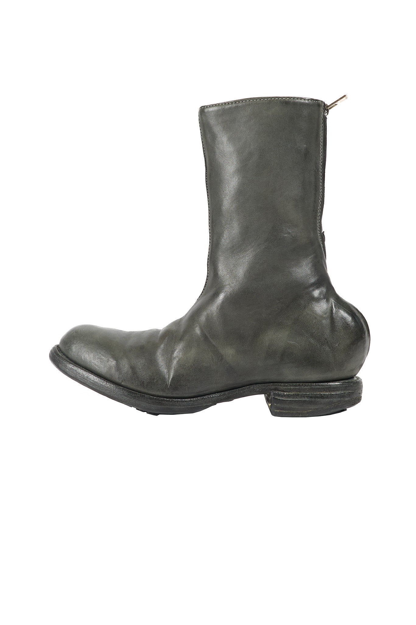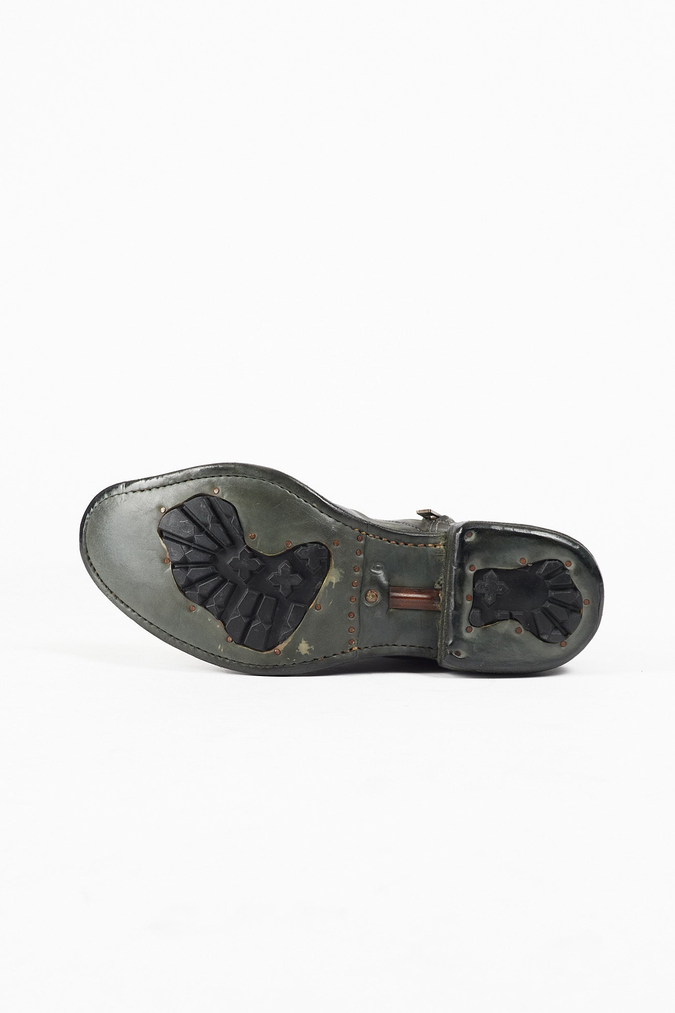 The Object Dyed Goodyear Orthopedic Spur-Biter Boot, model AM/2756P-IN, is crafted from CORSS-PTC horse leather, offering a unique blend of texture and feel. Featuring a distinctive titanium orthopaedic inserts design with a rugged spur-biter sole, this grey boot exemplifies Carol Christian Poell’s avant-garde approach to footwear.