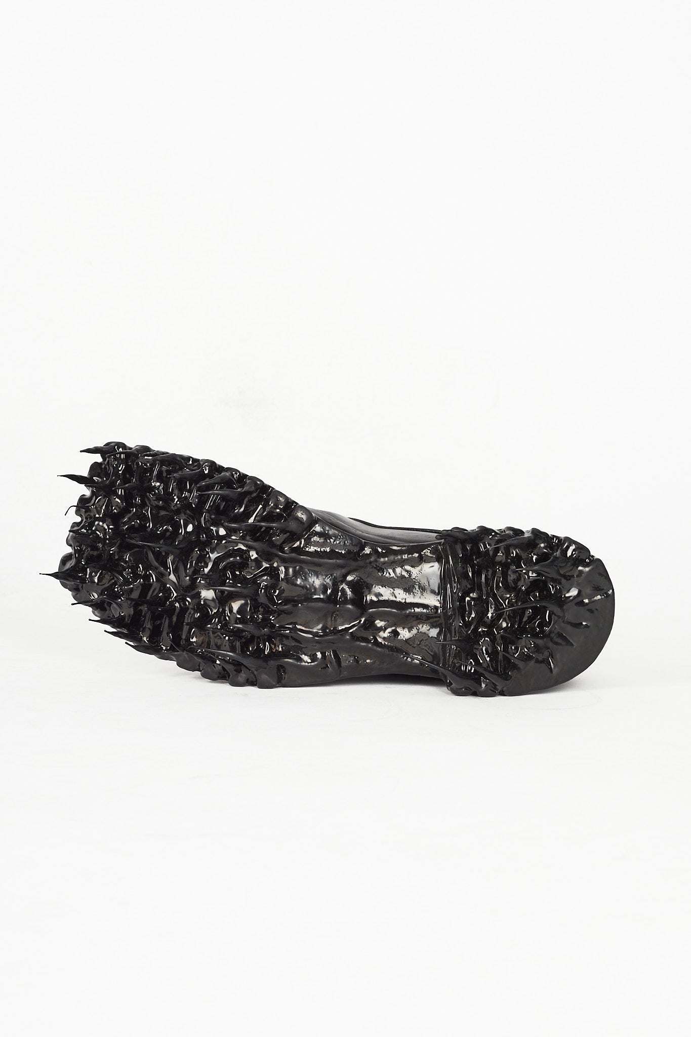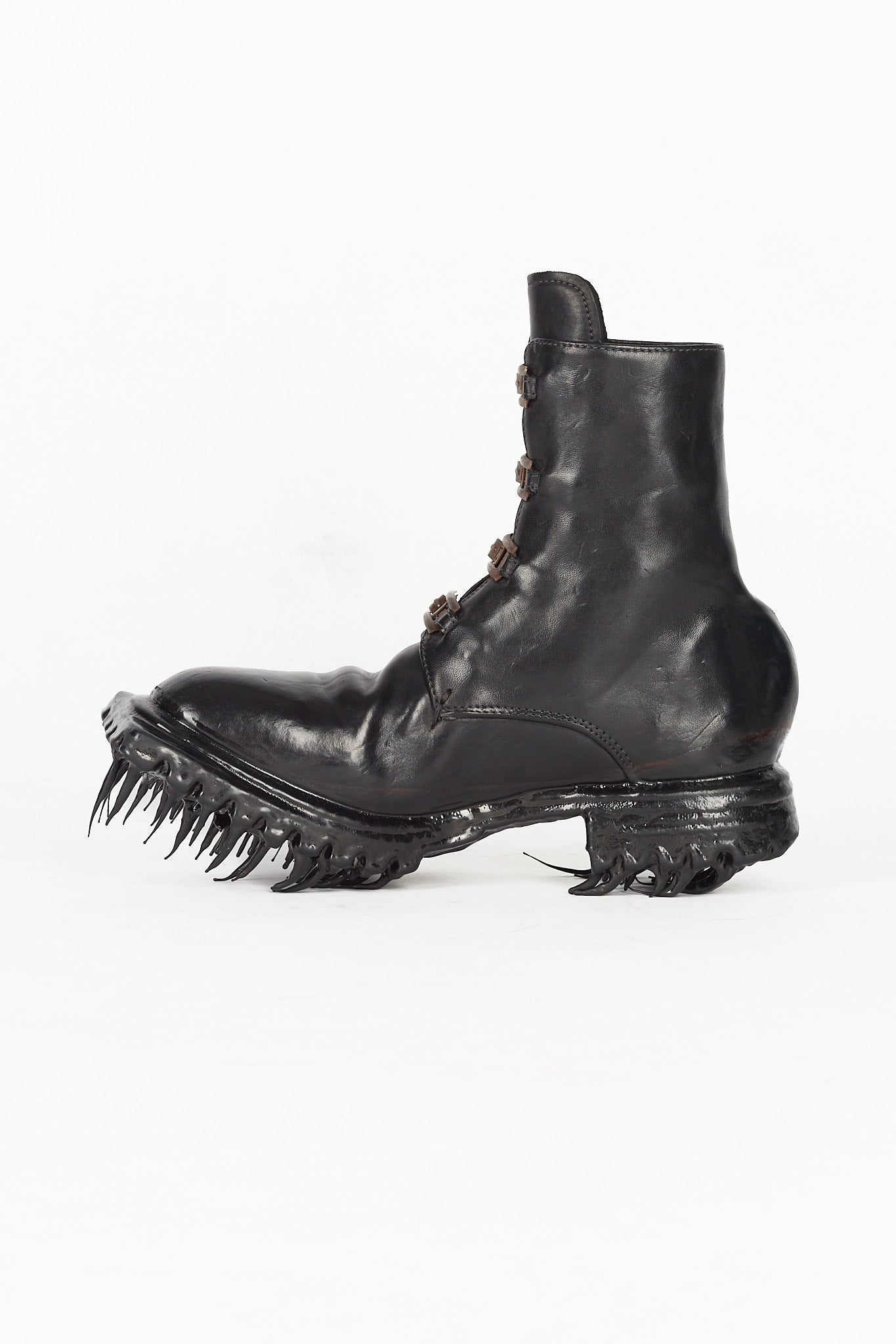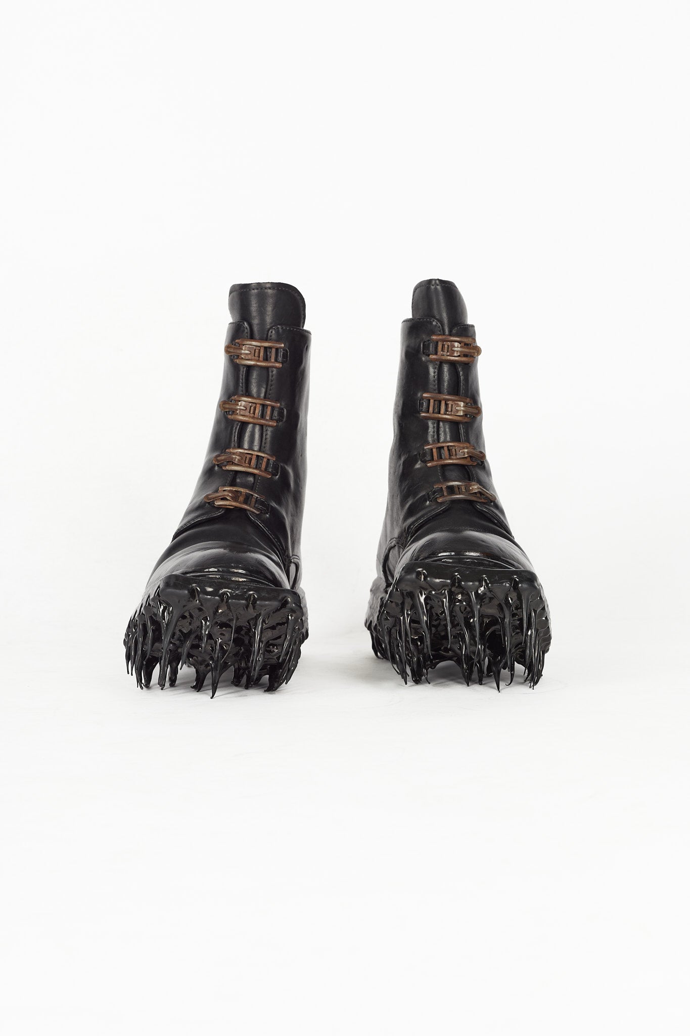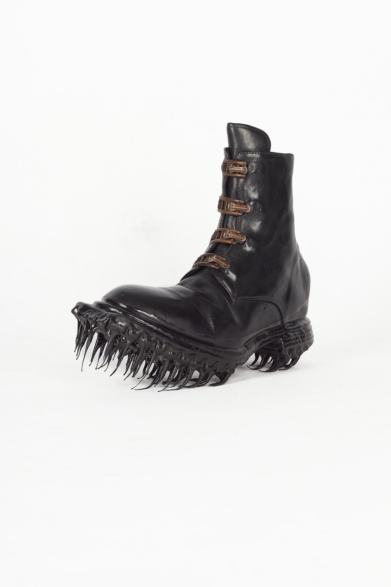 The AM/2759SP-IN model Object Dyed Goodyear Combat boot embodies Carol Christian Poell's vision of merging the avant-garde with artisanal craftsmanship. This shoe is crafted from CORSS-PTC in 100% horse leather, in black.