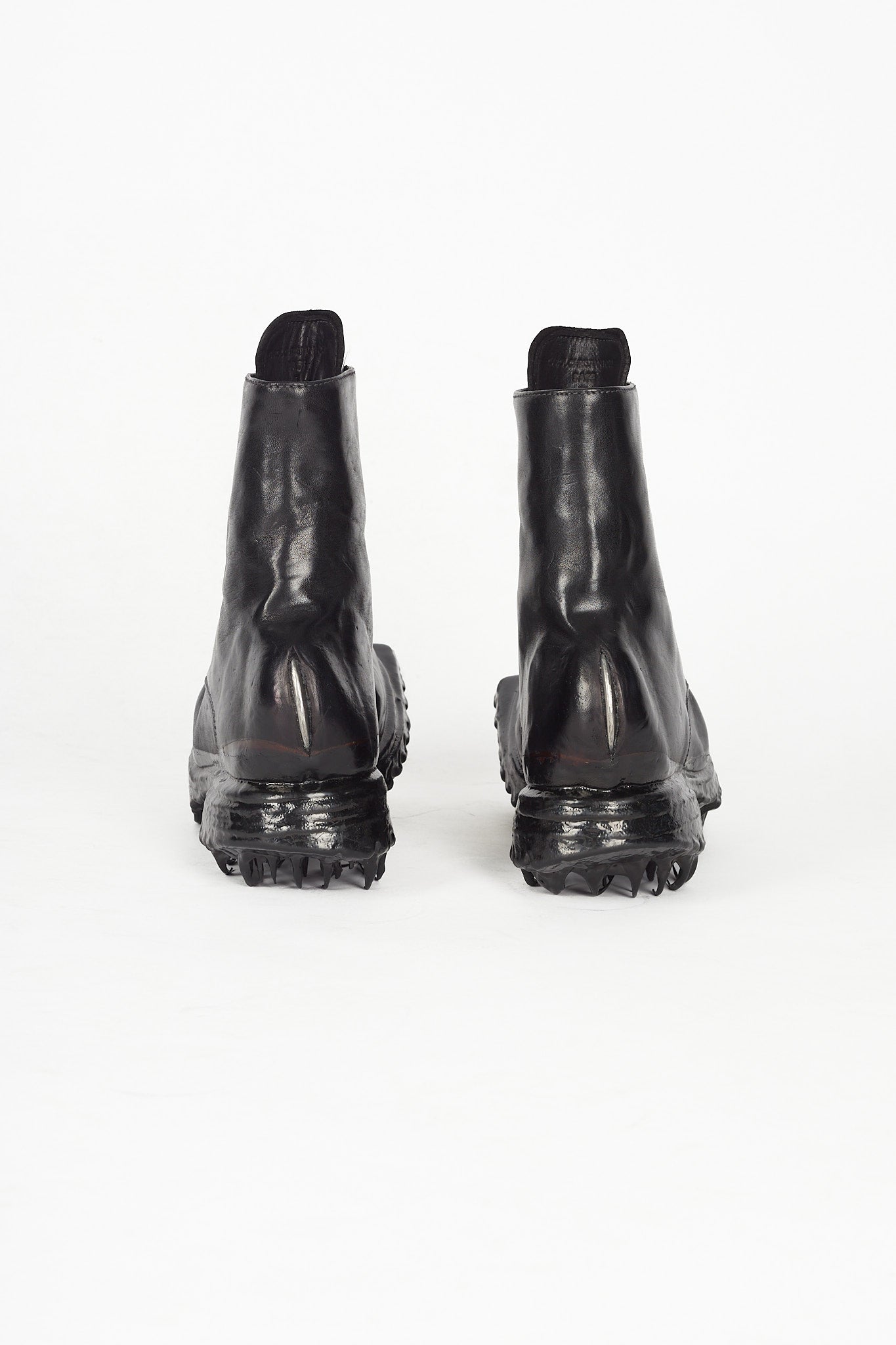 The footwear undergoes an object dyeing process, highlighting the natural grain and variation in the colour of the horse leather - resulting in a unique outcome for each individual piece. Laceless fastening, titanium prosthetic inserts, and signature drip soles add to the individuality of these Goodyear welted boots.