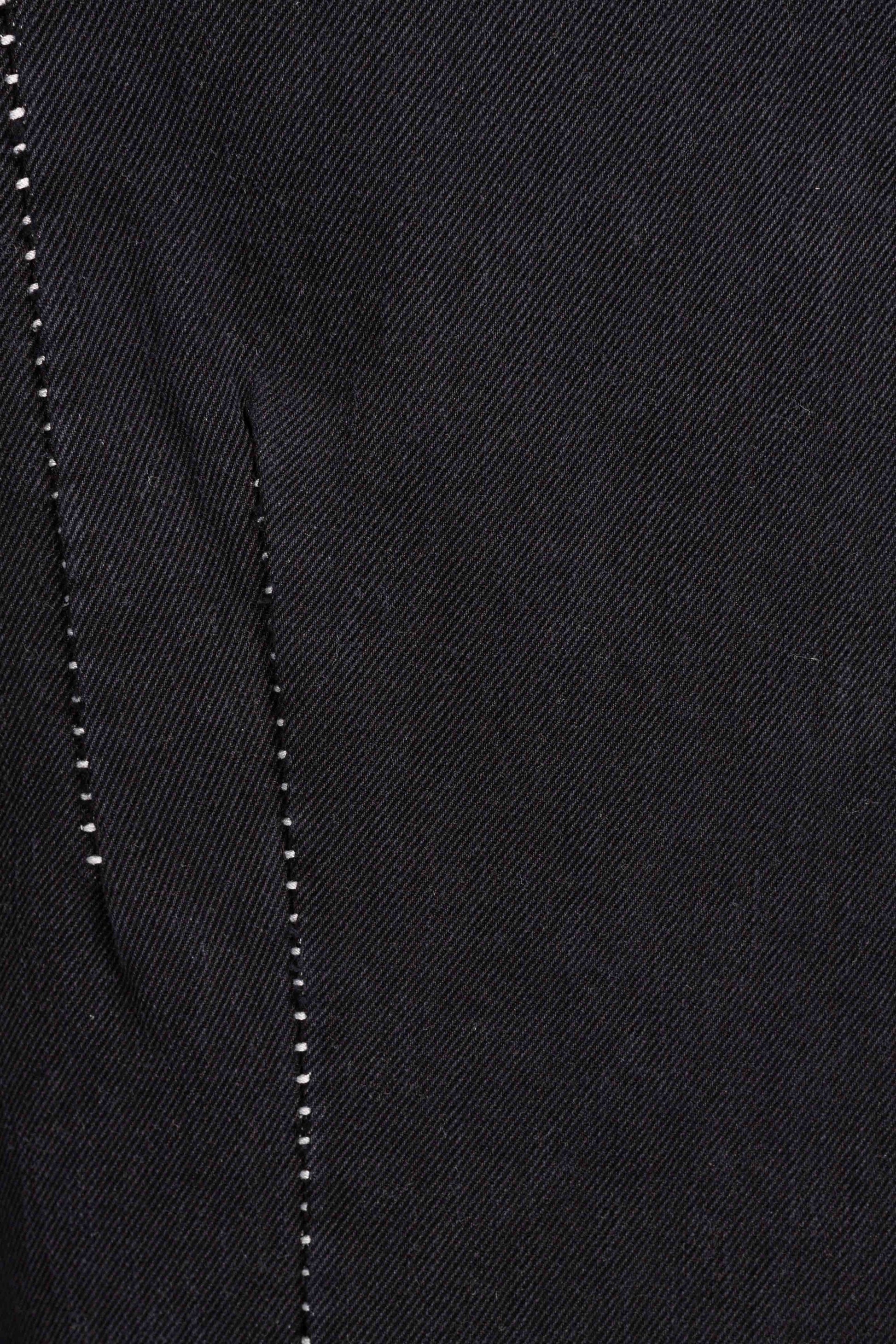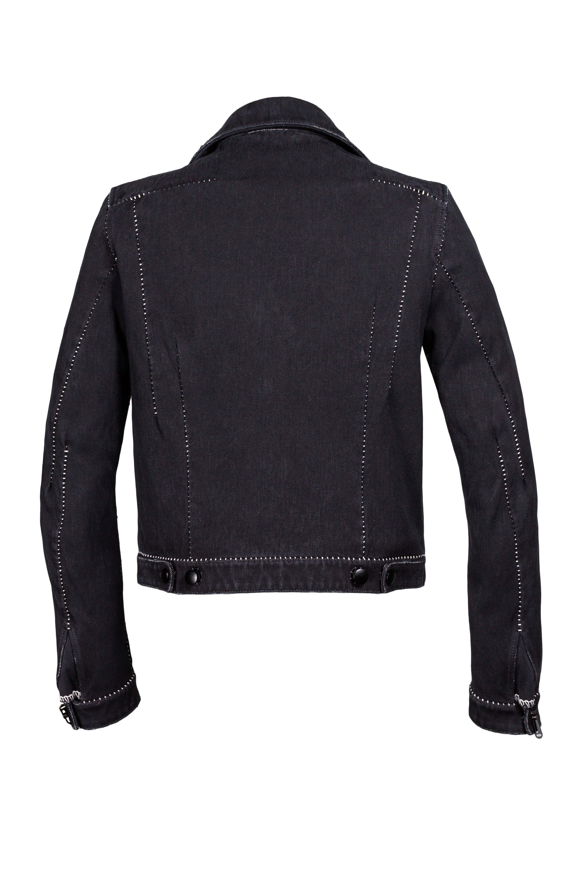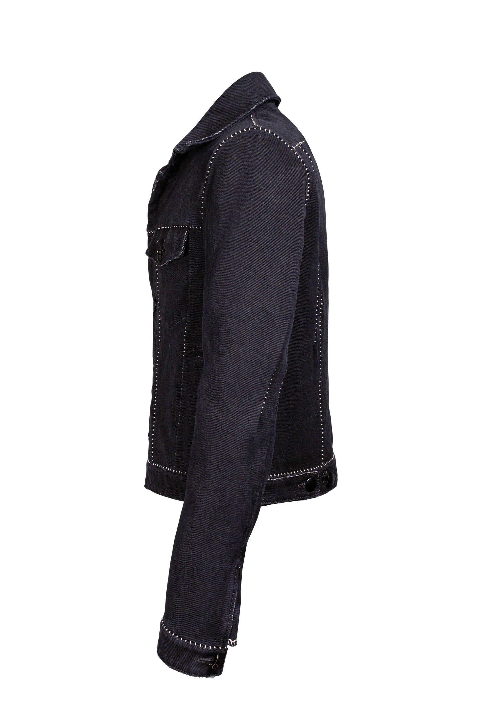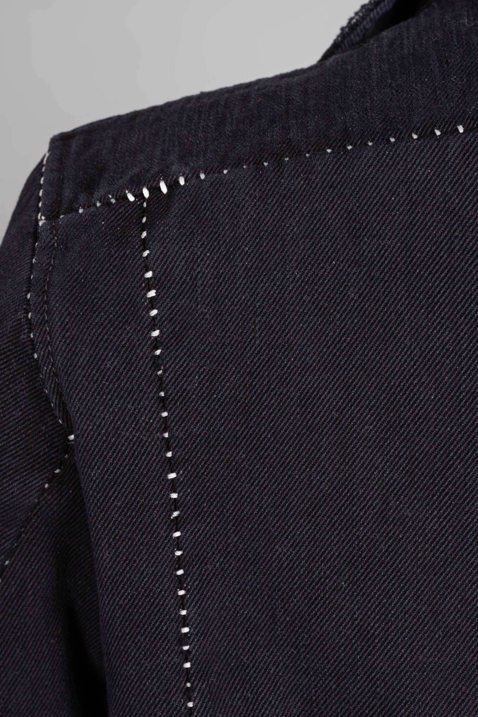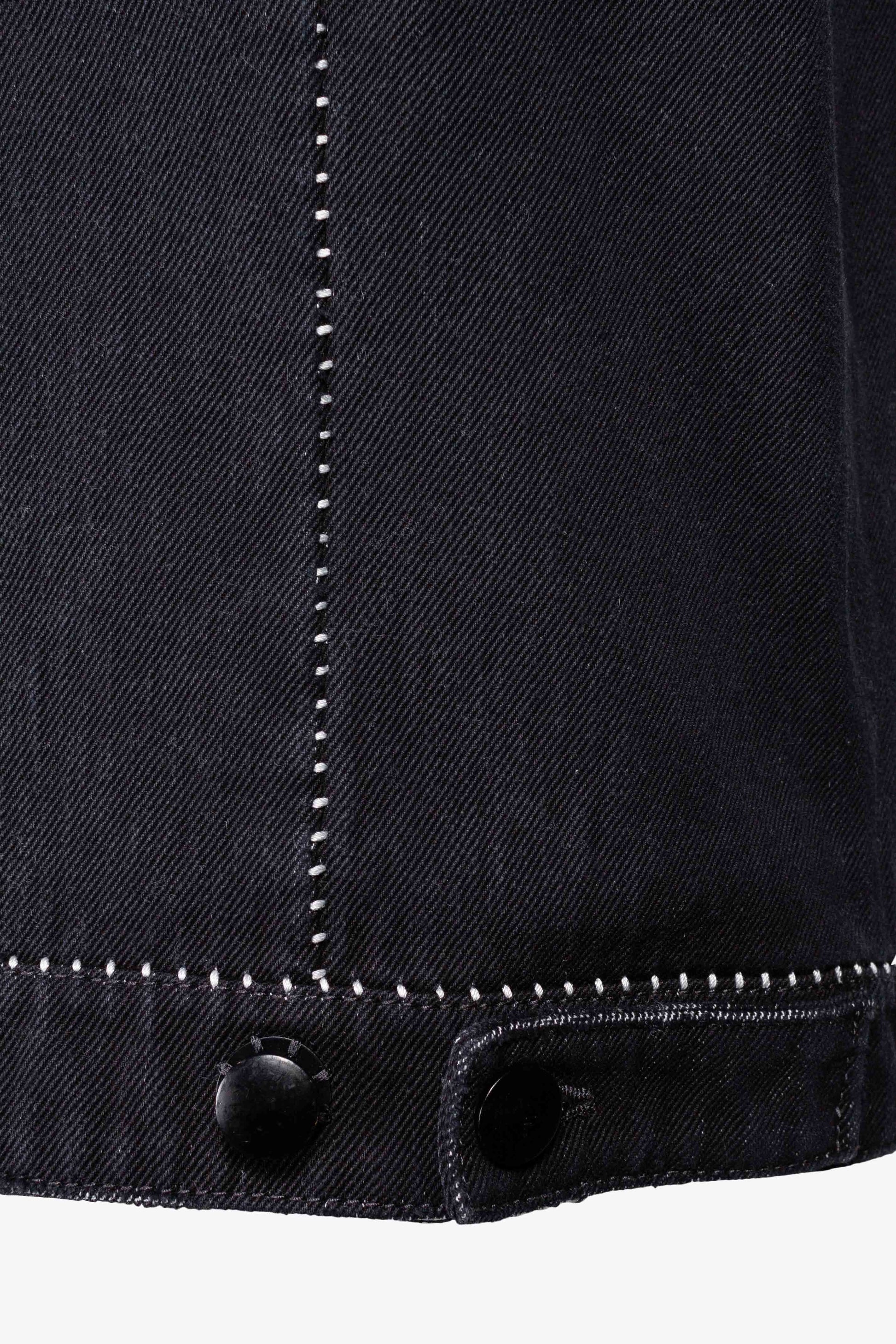 The Overlock Dead End Denim Jacket, model JM/2568, is a contemporary take on the classic denim jacket, distinguished by its use of innovative processes and craftsmanship. Constructed from the KIT-BW material, it features a black/white tone. The jacket is characterised by its overlock stitching, cropped length and fitted silhouette. This jacket represents a blend of traditional denim aesthetics and avant-garde detailing.