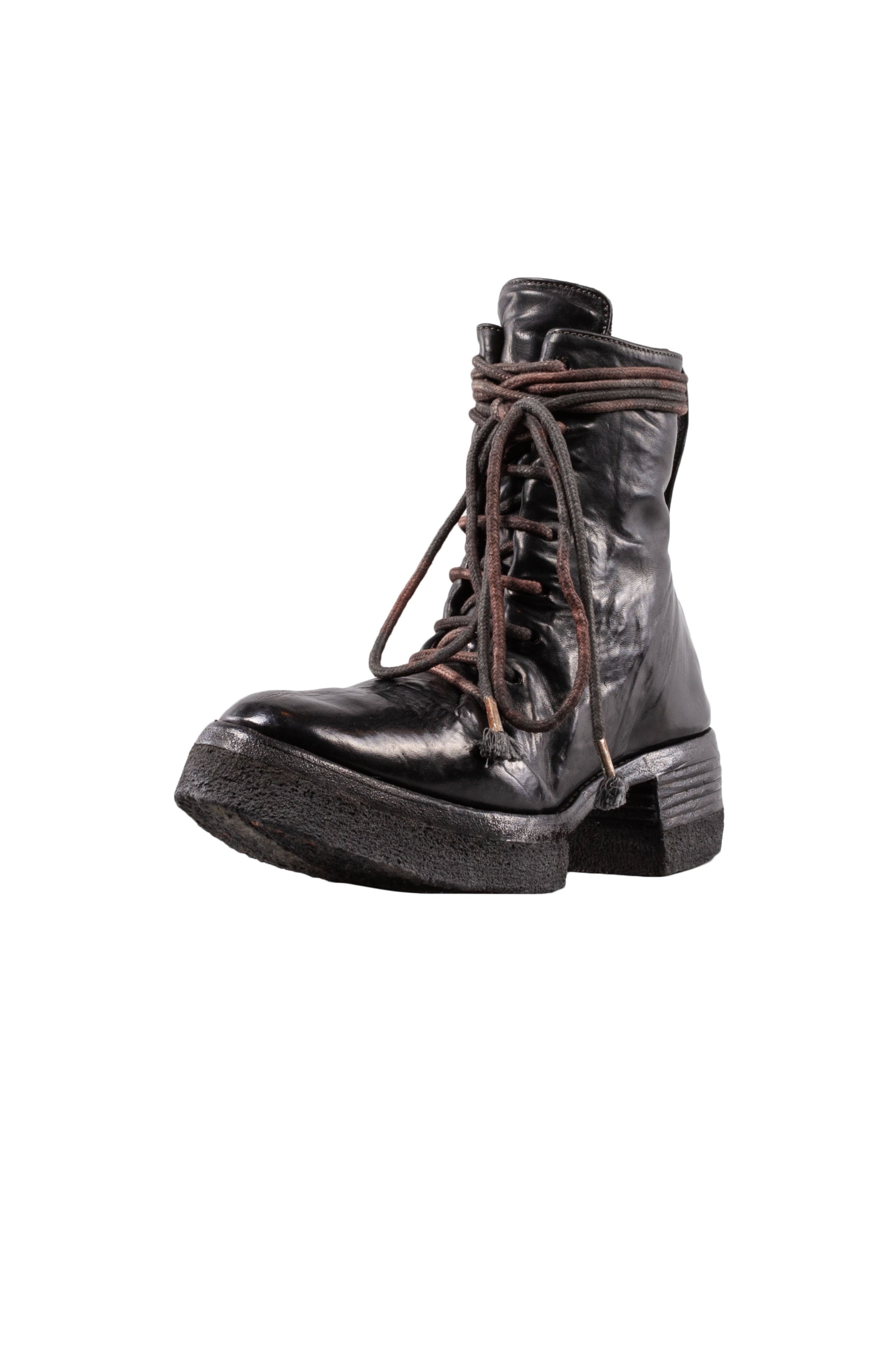 The AF/0906-IN model combat boot embodies Carol Christian Poell's vision of utilising artisanal craftsmanship to push the boundaries of traditional footwear. This shoe is crafted from CORS-PTC in 100% horse leather, in black (Colour: 10).
