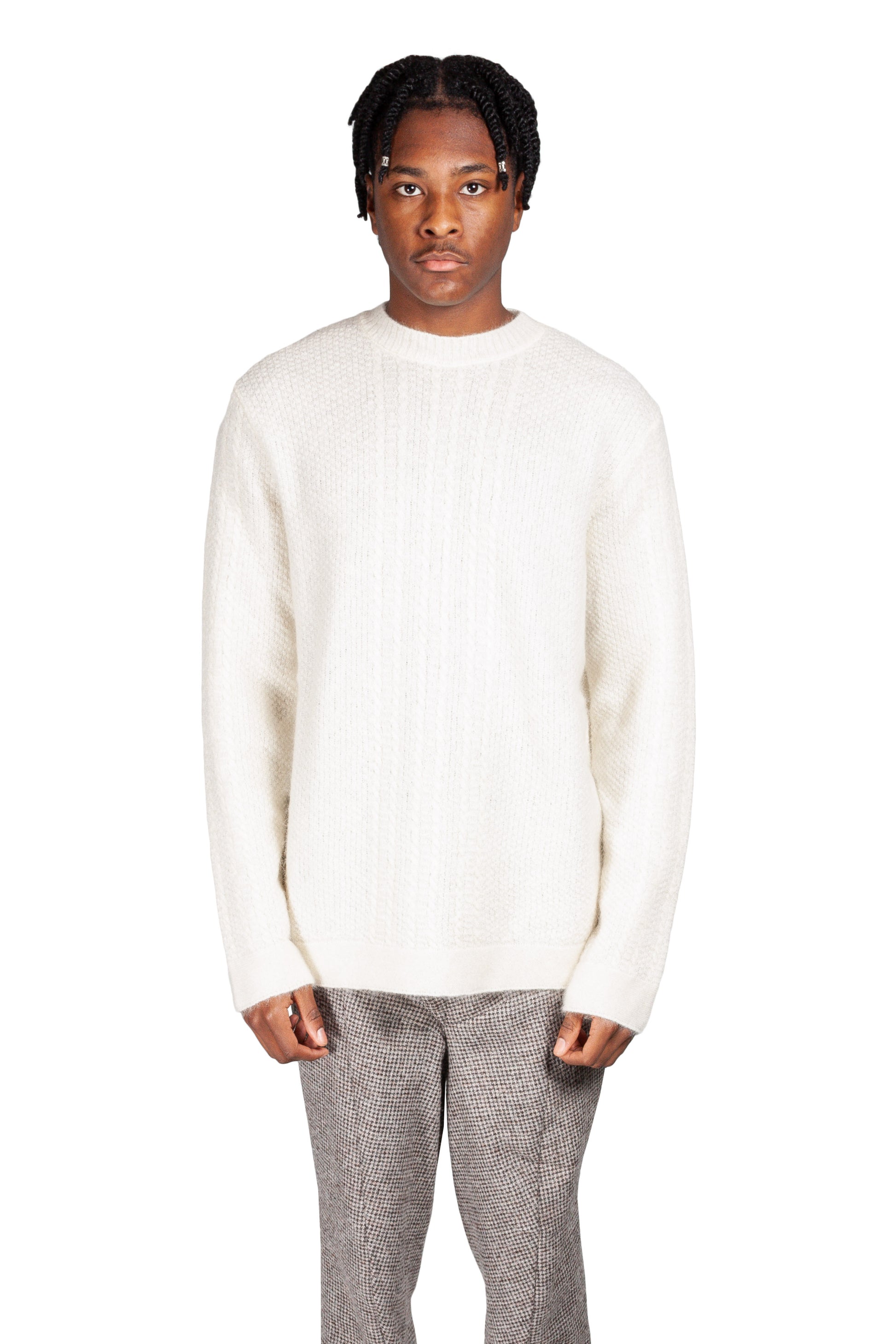 White crew neck sweater by MarcandcraM, a knitwear staple crafted from a luxurious blend of mohair and virgin wool. With a classic round neckline and captivating visual texture enhancing the white colour, this sweater is an elevated essential addition to your wardrobe.