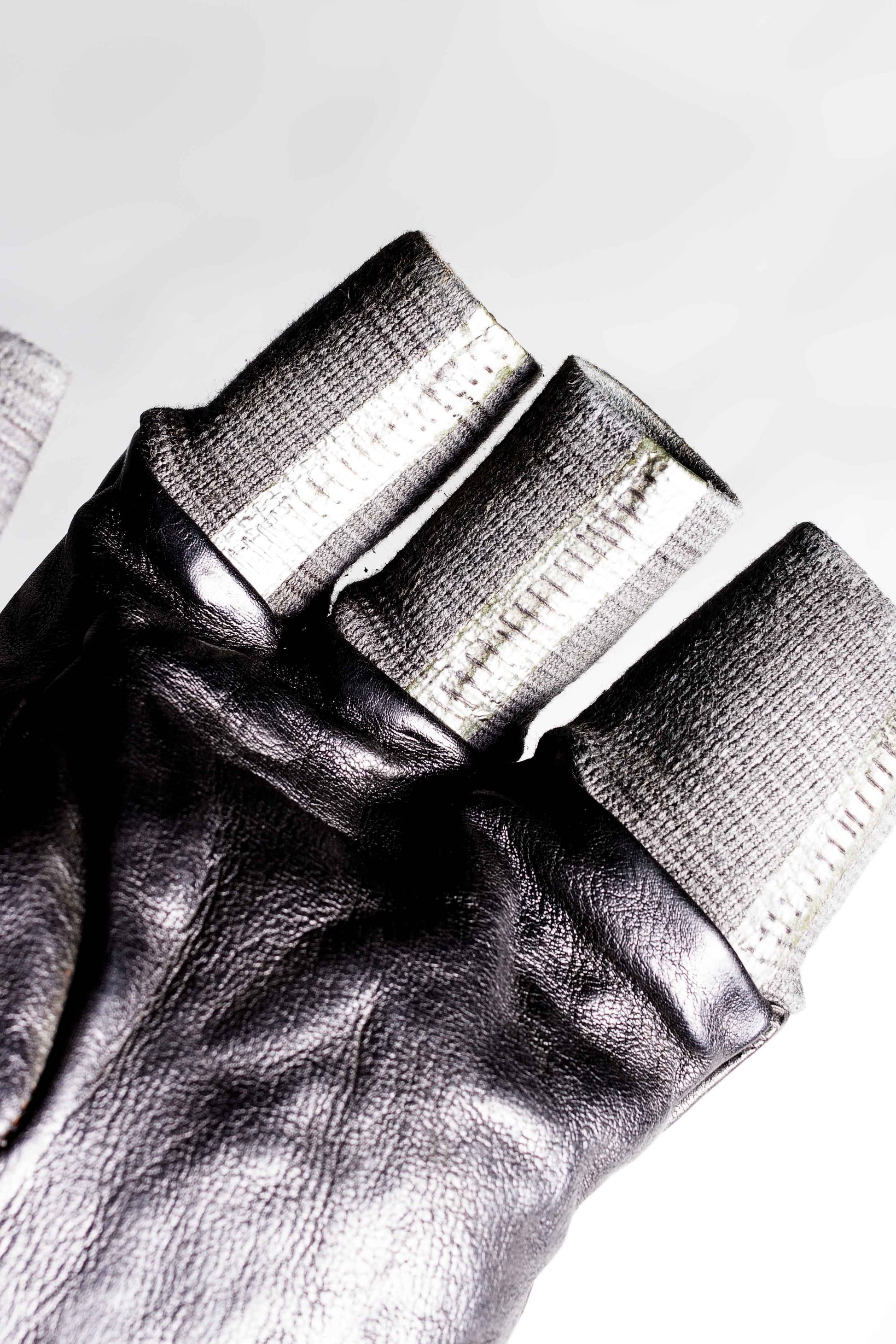 The gloves stand out due to their distinctive fingercuff feature, a design choice that merges elegance with an edge. This detail not only provides a secure fit but also adds a visual contrast, especially with the intriguing variation in black colour.