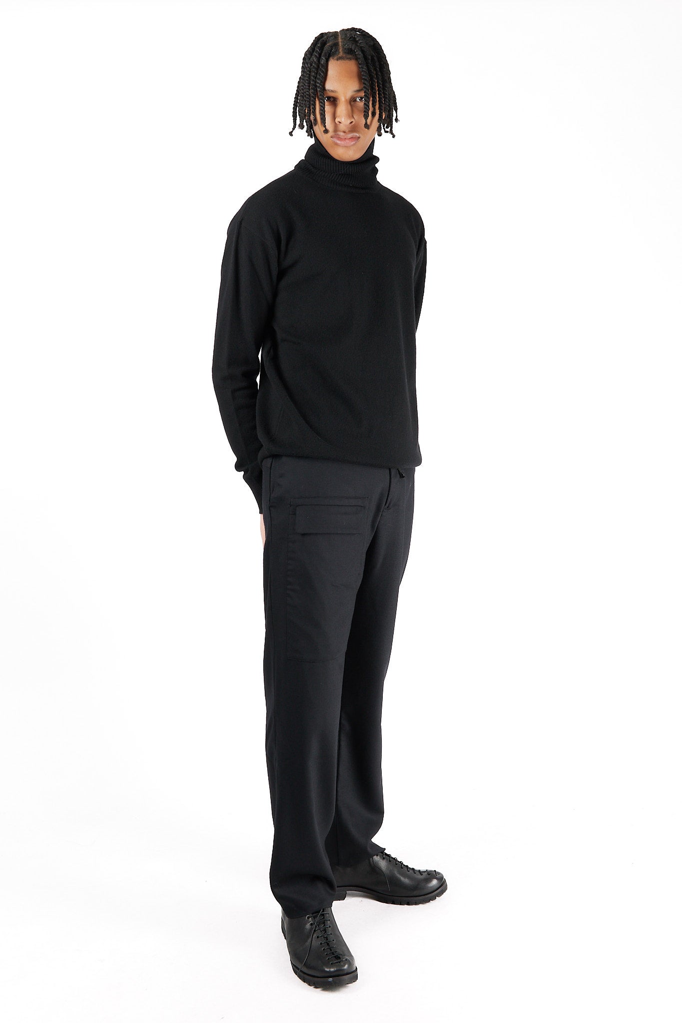 Daub's Front Pocket Pants with Strings in black exemplify the brand's thoughtful approach to contemporary menswear. Crafted from premium virgin wool with minimal elastane for comfort, these pants feature distinctive front pockets and drawstring details that create subtle visual interest while maintaining practical functionality. The fine wool fabric offers exceptional drape and thermal regulation, while the clean lines and considered proportions reflect Daub's commitment to creating refined essentials with subtle artistic elements that elevate everyday garments beyond the purely utilitarian.