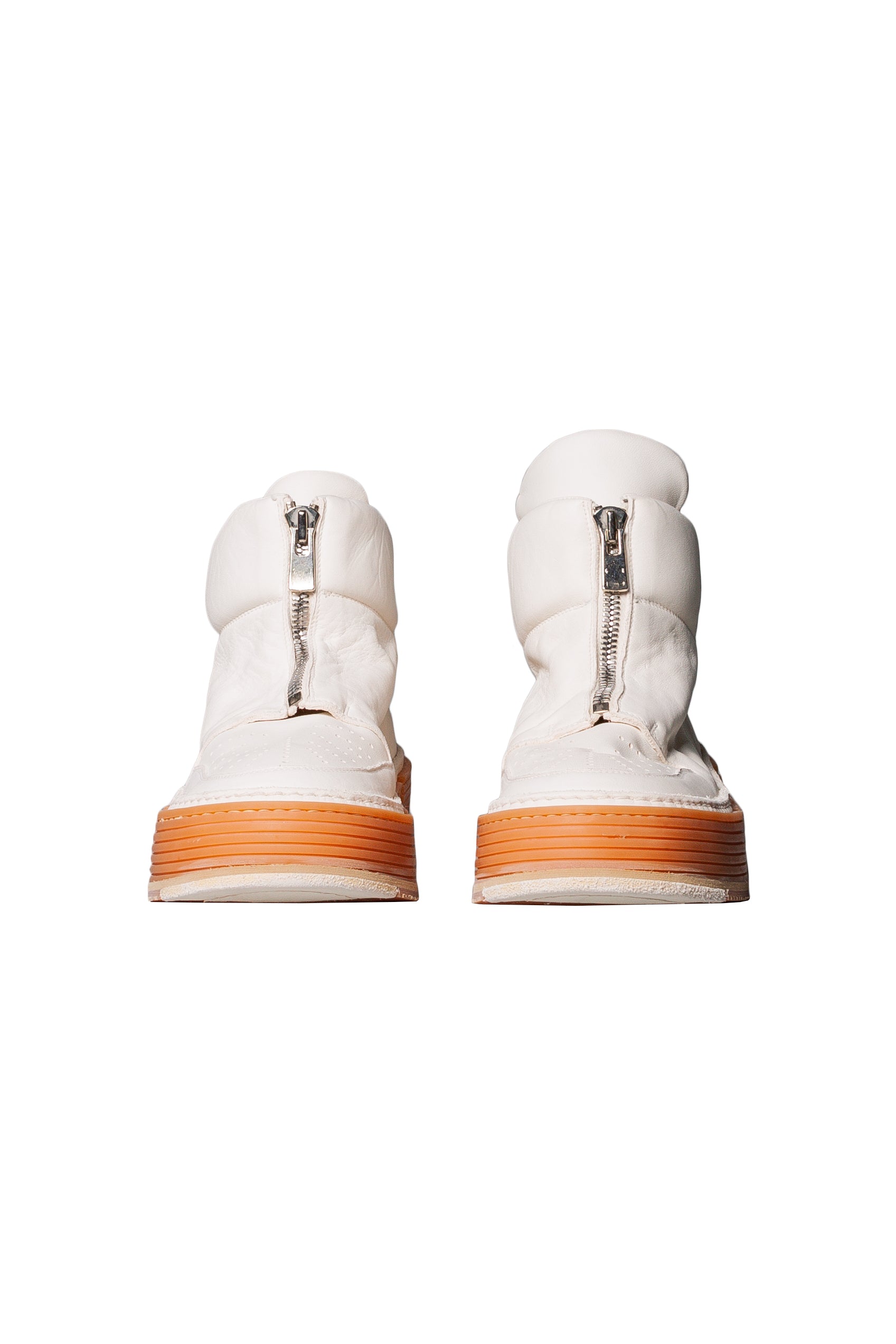 The GJ03 Leather Boots, presented in a subtle off-white, are a celebration of GUIDI's artisanal prowess and avant-garde aesthetic. These boots, with their exquisite coated finish, showcase the brand's mastery in creating textures that are both visually striking and tactilely engaging. The perforated detailing is not just a design element, but a testament to the meticulous attention to detail and craftsmanship. The round toe and front zip fastening maintain a clean and contemporary line, while the pull-tab at the heel adds a touch of understated elegance. The boots are completed with a branded leather insole, a subtle nod to GUIDI's heritage of luxury. Resting on a flat rubber sole, these boots are a remarkable fusion of artistic design and the timeless tradition of Italian leatherwork.