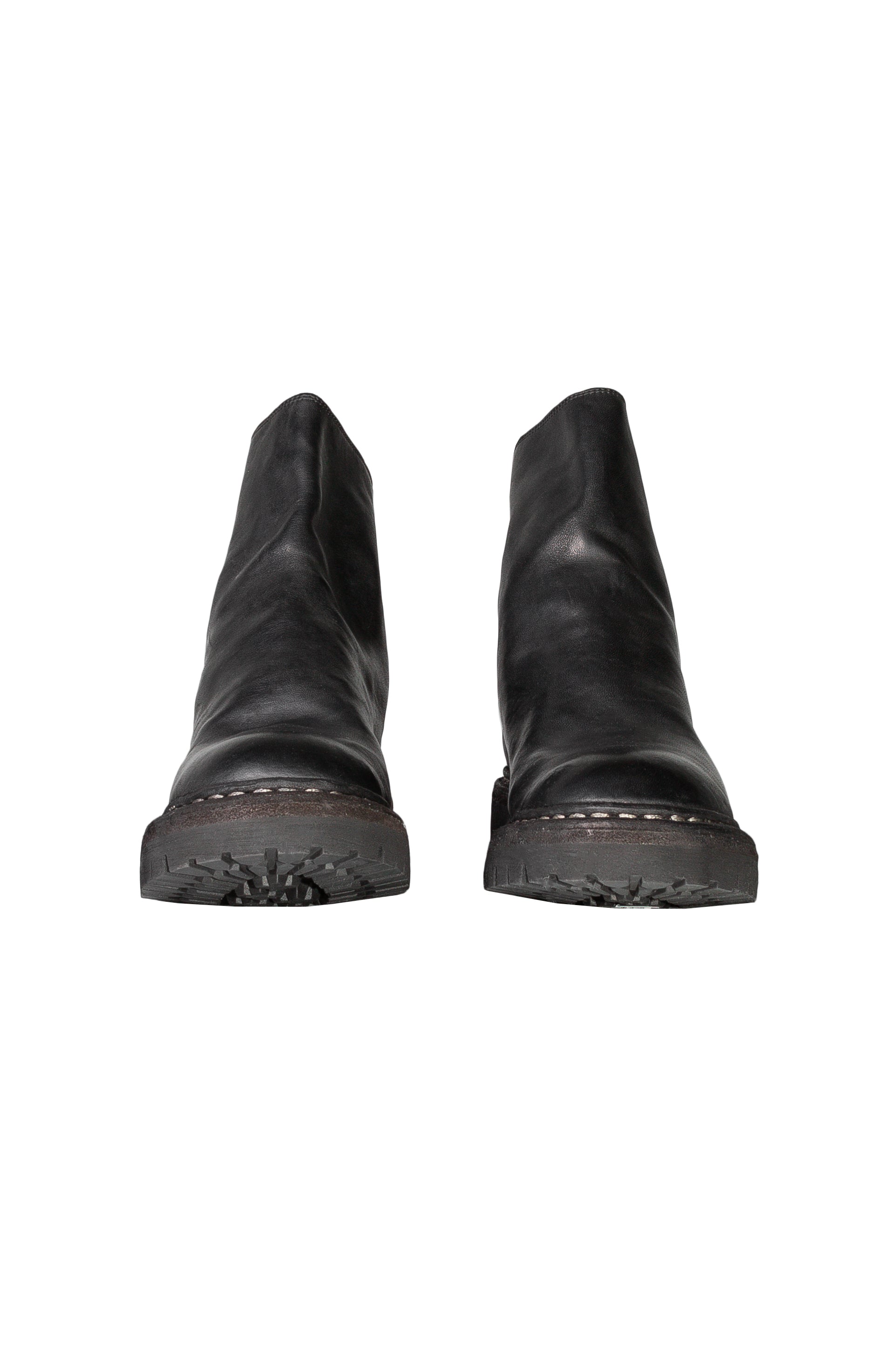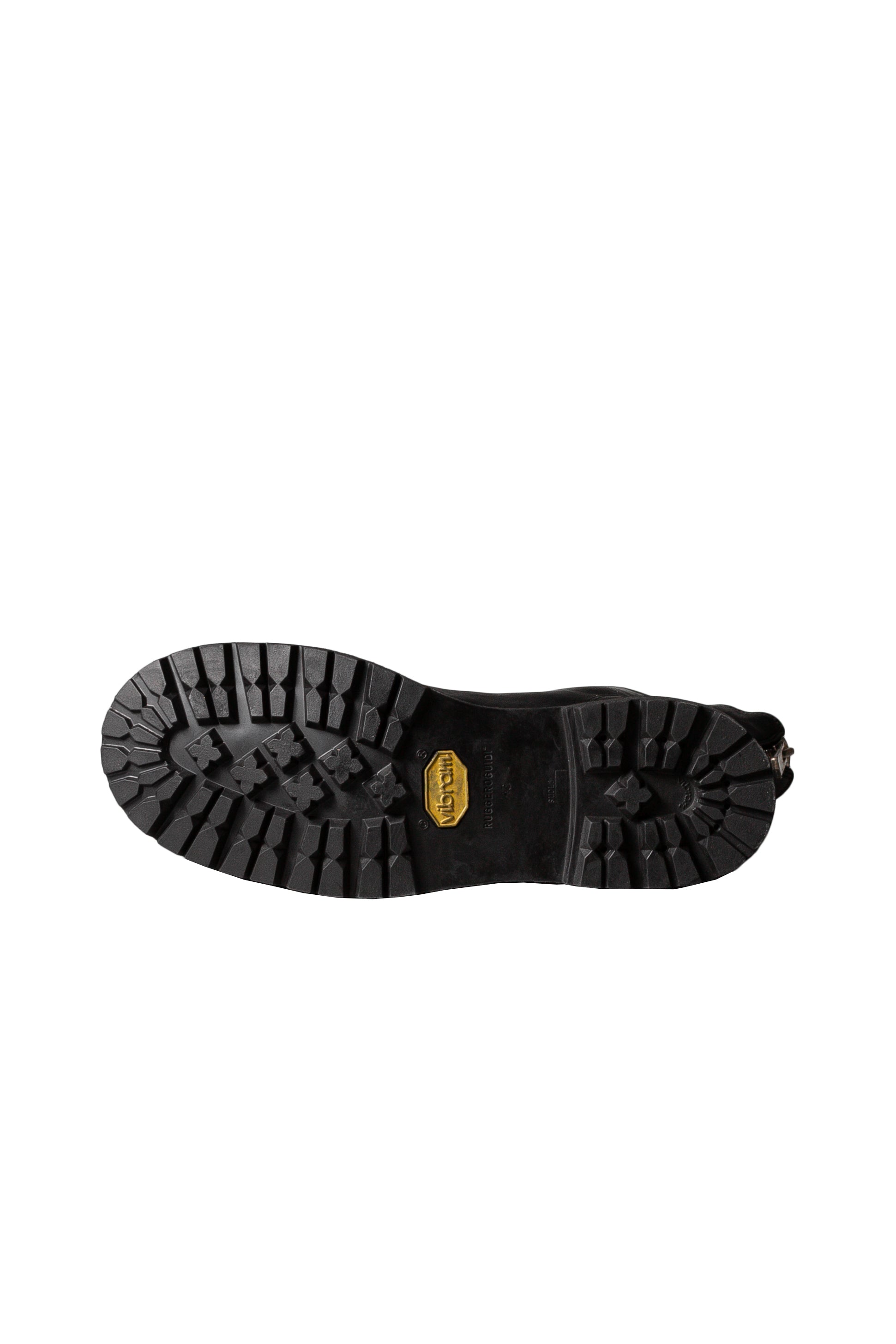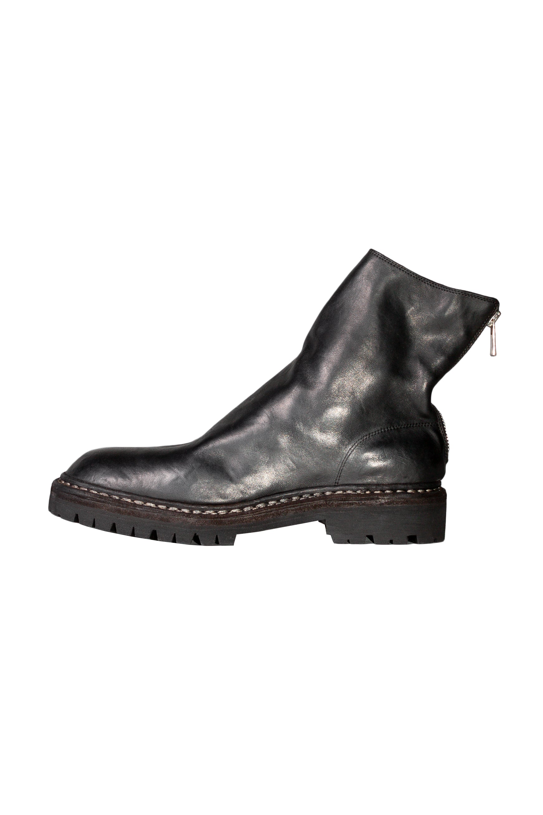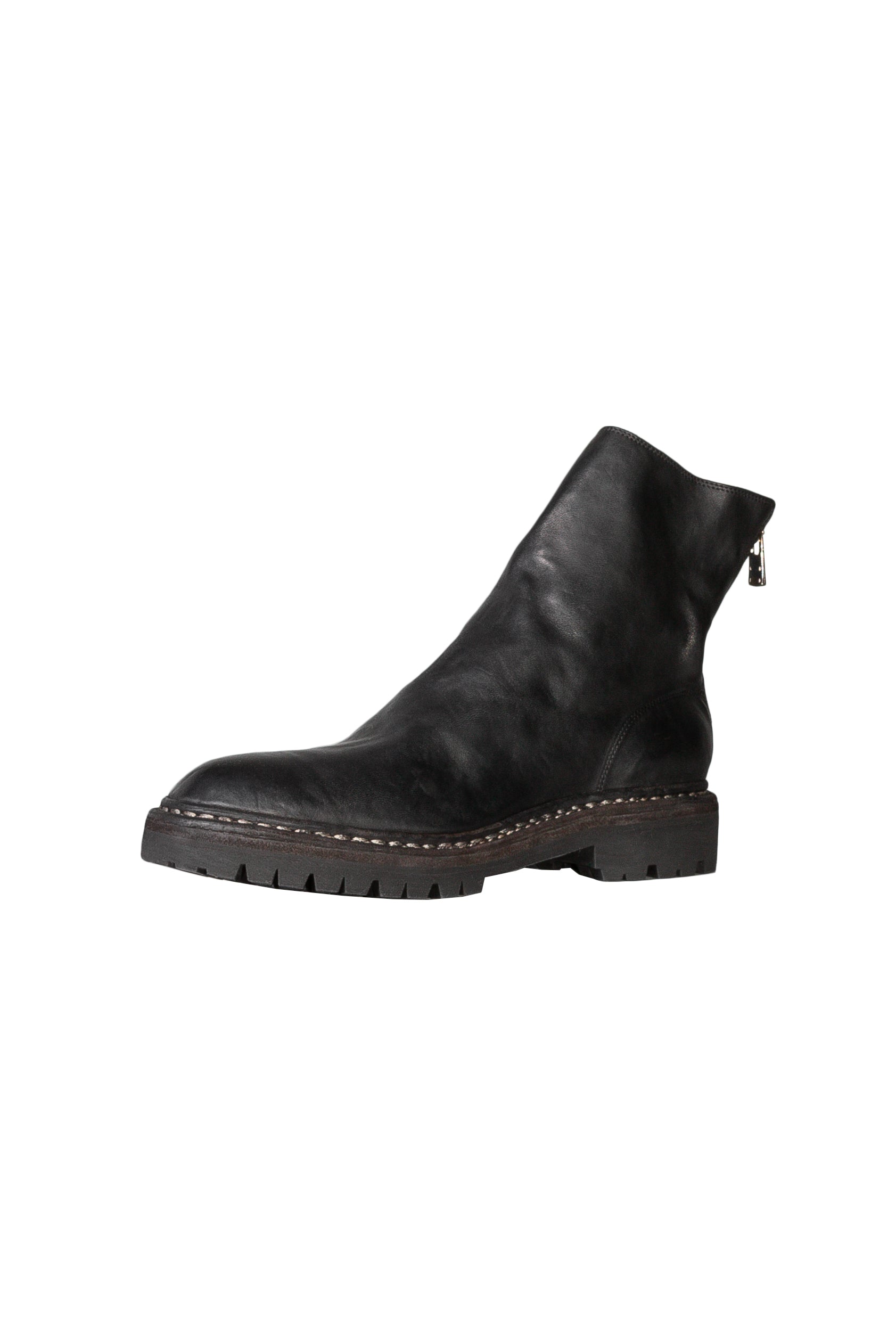 The GUIDI Lined Back Zip Boot in Black, expertly handcrafted from 100% full grain horse leather, represents the quintessence of the brand's commitment to quality and innovation. Made in Italy, this ankle-high boot displays a distinguished black hue, enhanced by GUIDI's celebrated object-dyeing process. The boot's design features a back zip closure at the heel and a grained leather lining for supreme comfort. It's layered topstitching in grey at the welt adds a subtle contrast, while the stacked leather heel and treaded Vibram® rubber sole combine durability with sophisticated style. The boot's Goodyear construction ensures longevity. The logo-engraved antiqued silver-tone hardware complements the overall aesthetic, making this boot a timeless piece of footwear artistry.