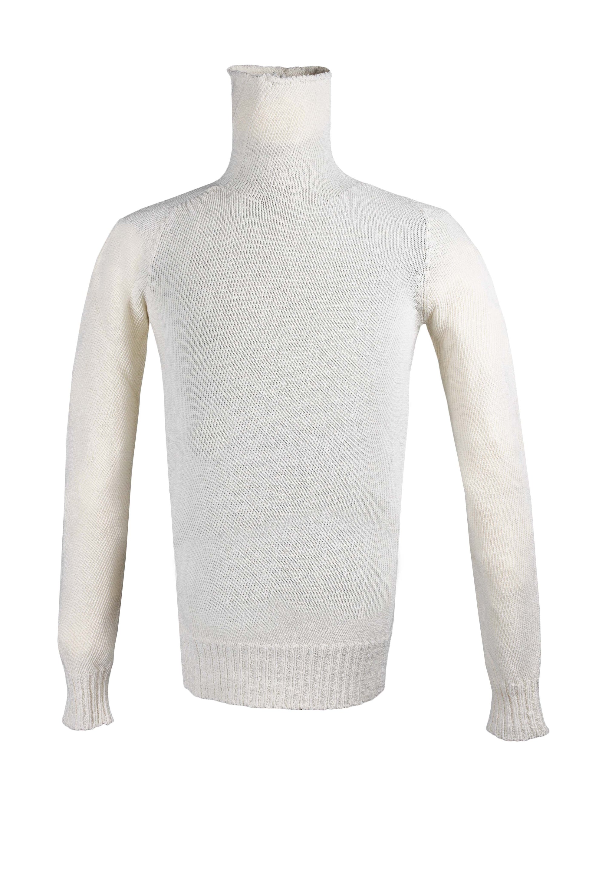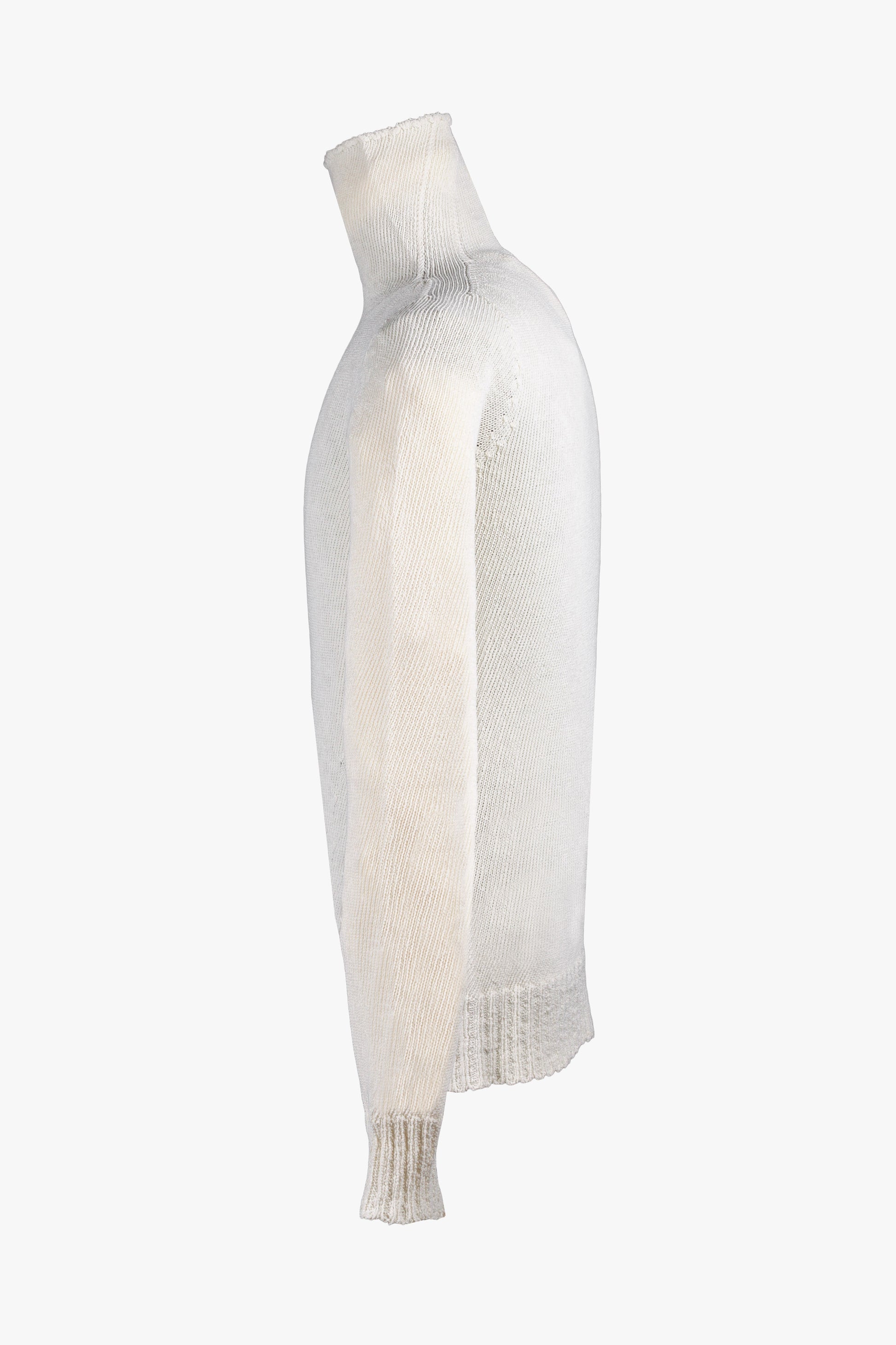 The Reversible Turtle Neck Knit Sweater, model KM/2630-IN, presents a reinterpretation of the classic turtleneck silhouette through the use of advanced 3D knitting technology. Fabricated from Pentasir, in 100% virgin wool, this white sweater embodies an understated aesthetic. The knit features a reversible design, and its use of 3D knitting produces an anatomical fit.