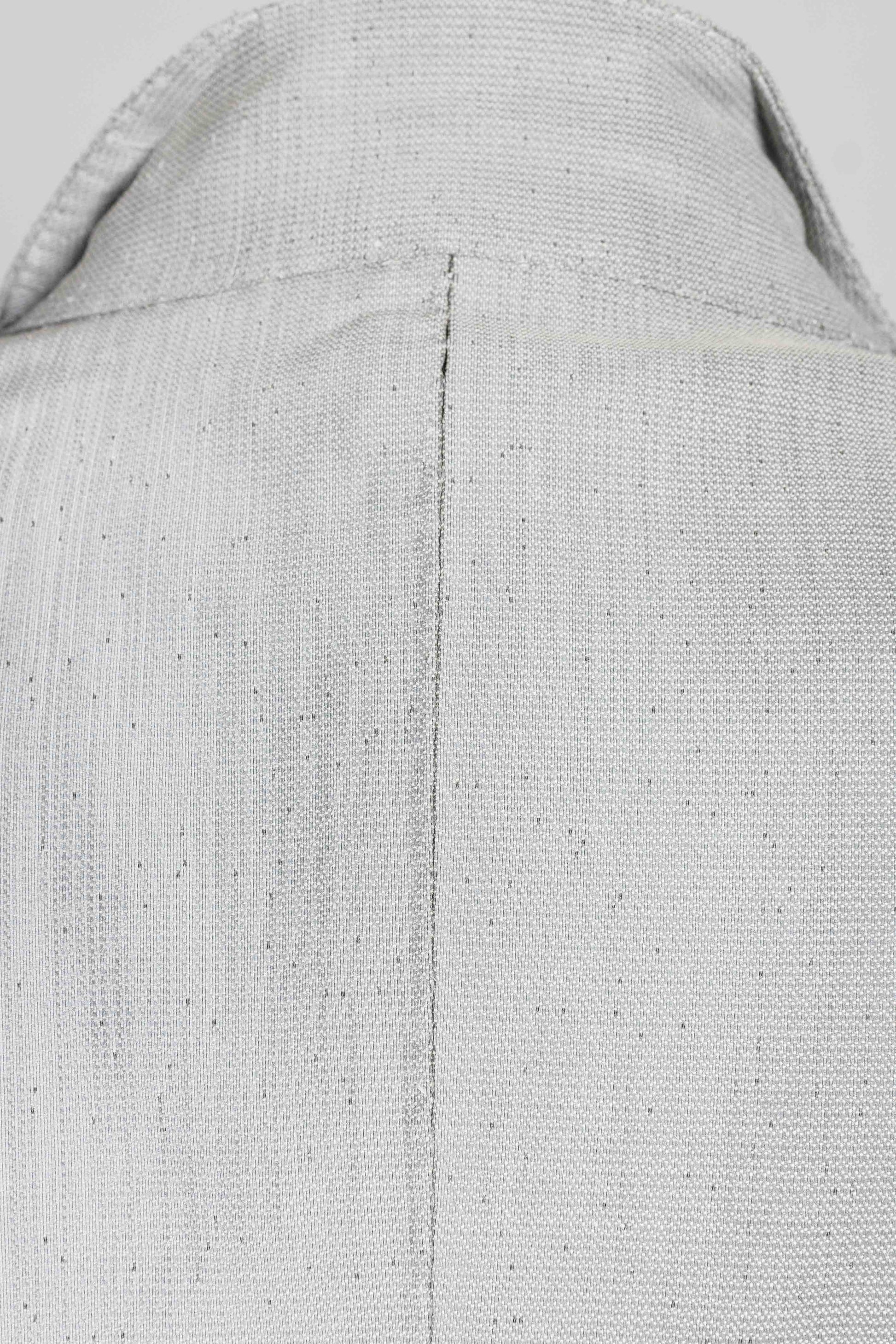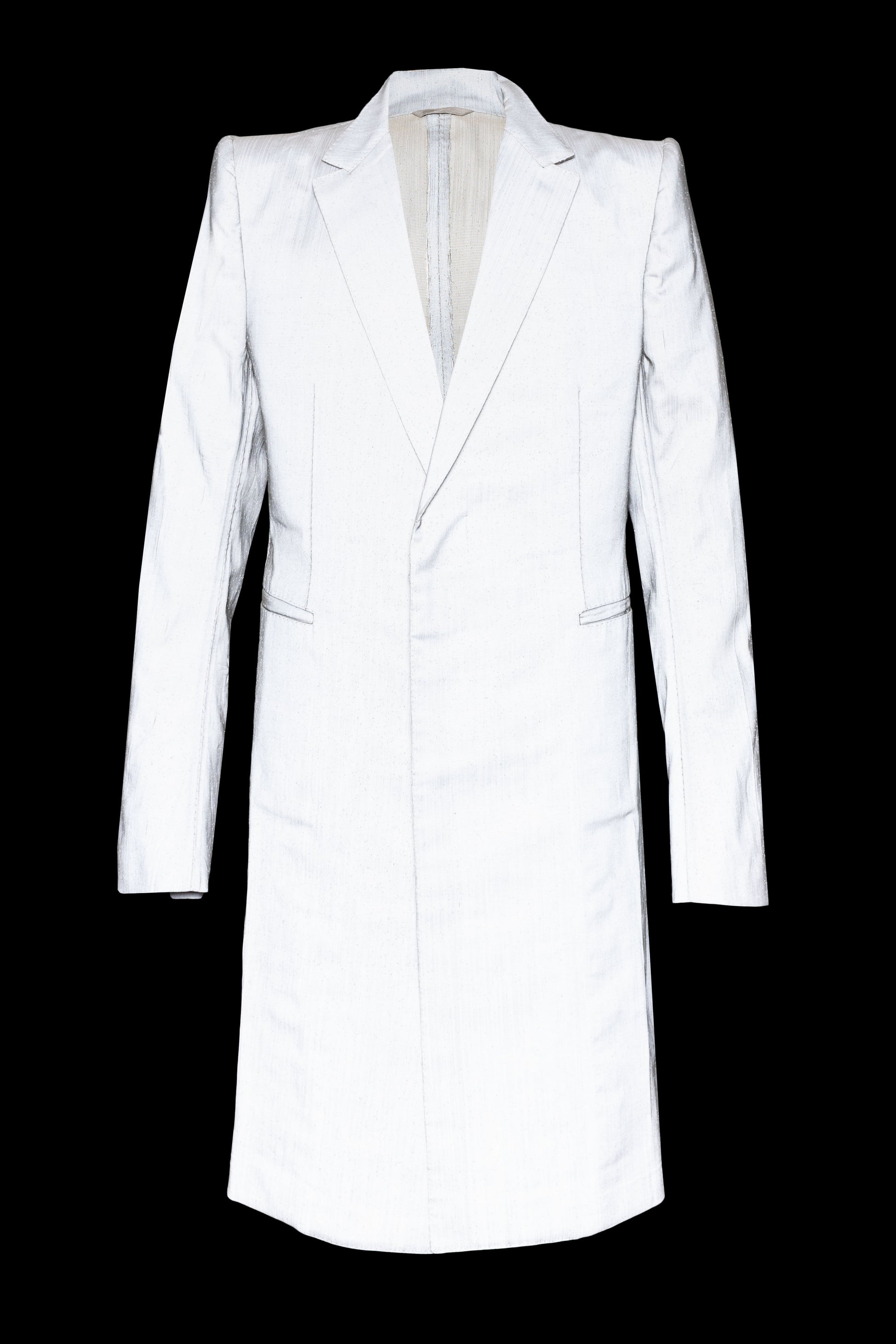 The Stirred Unlined Chain Seam 1 Button Long Jacket, model GM/2801-IN, is a fusion of modern artistry and material innovation. Made from the distinctive XNIGHT fabric, a blend incorporating polyester, glass, and cotton, this jacket presents a mesmerising grey tone in natural light, and luminescent glow in the dark. Its characteristic feature, the chain seam construction, is a Carol Christian Poell signature, while the single button closure complements the jacket's tailored silhouette.