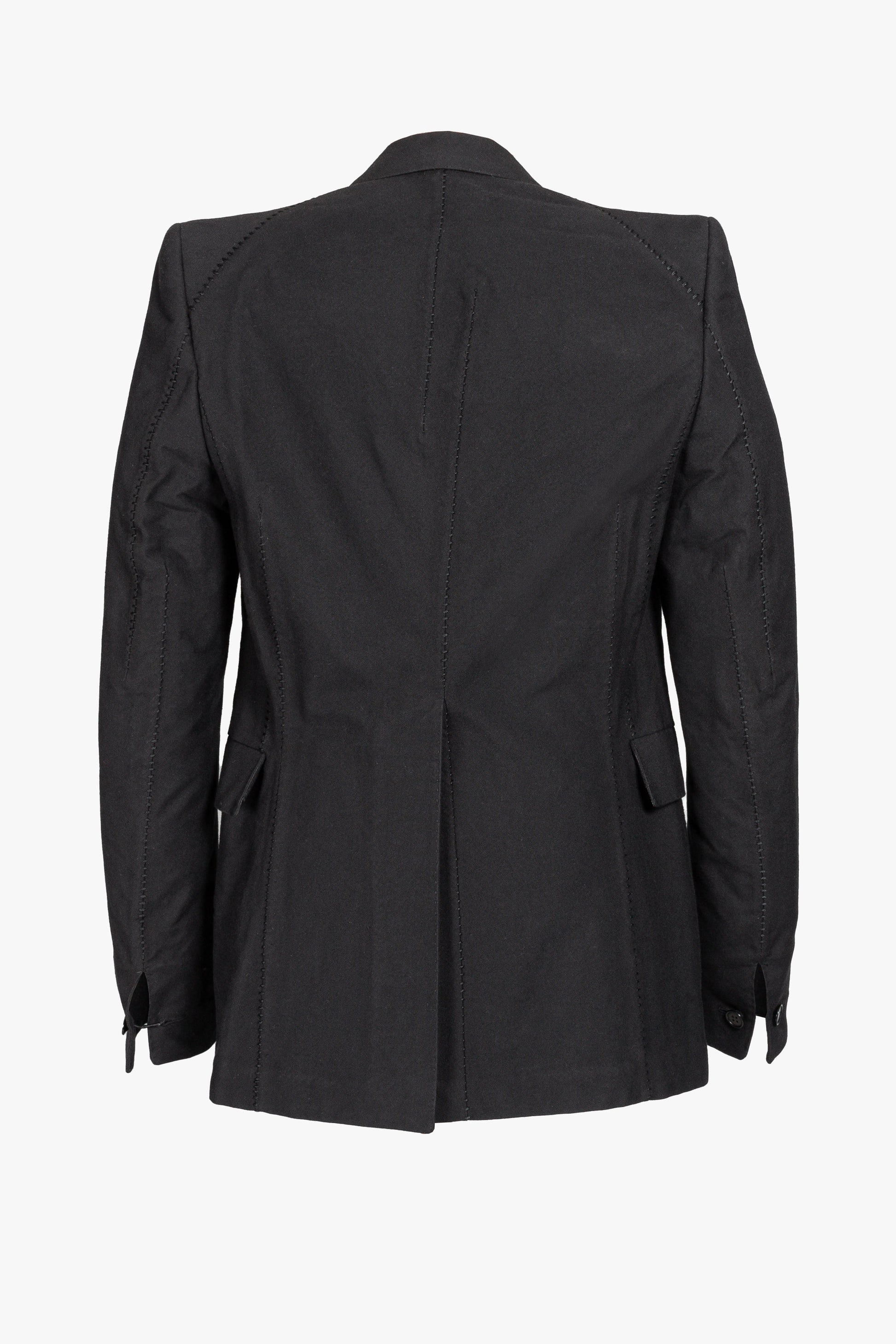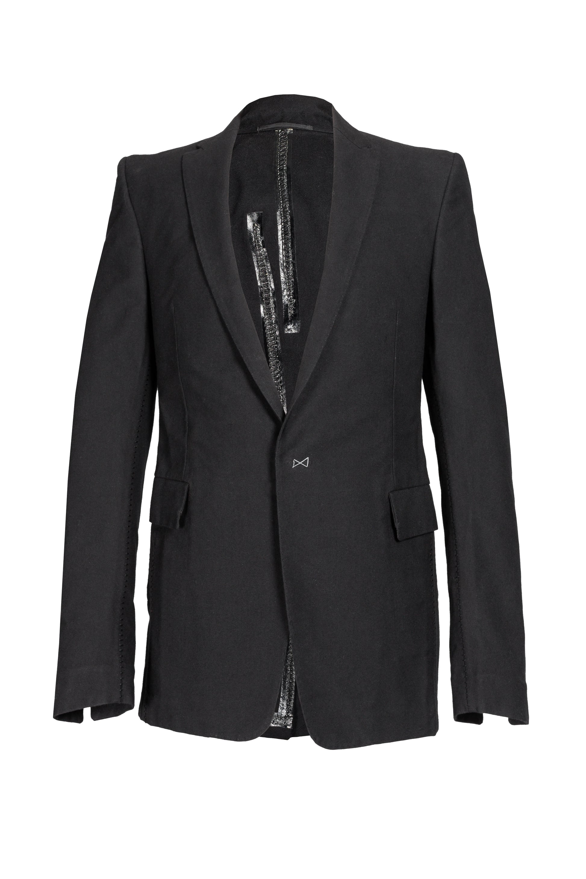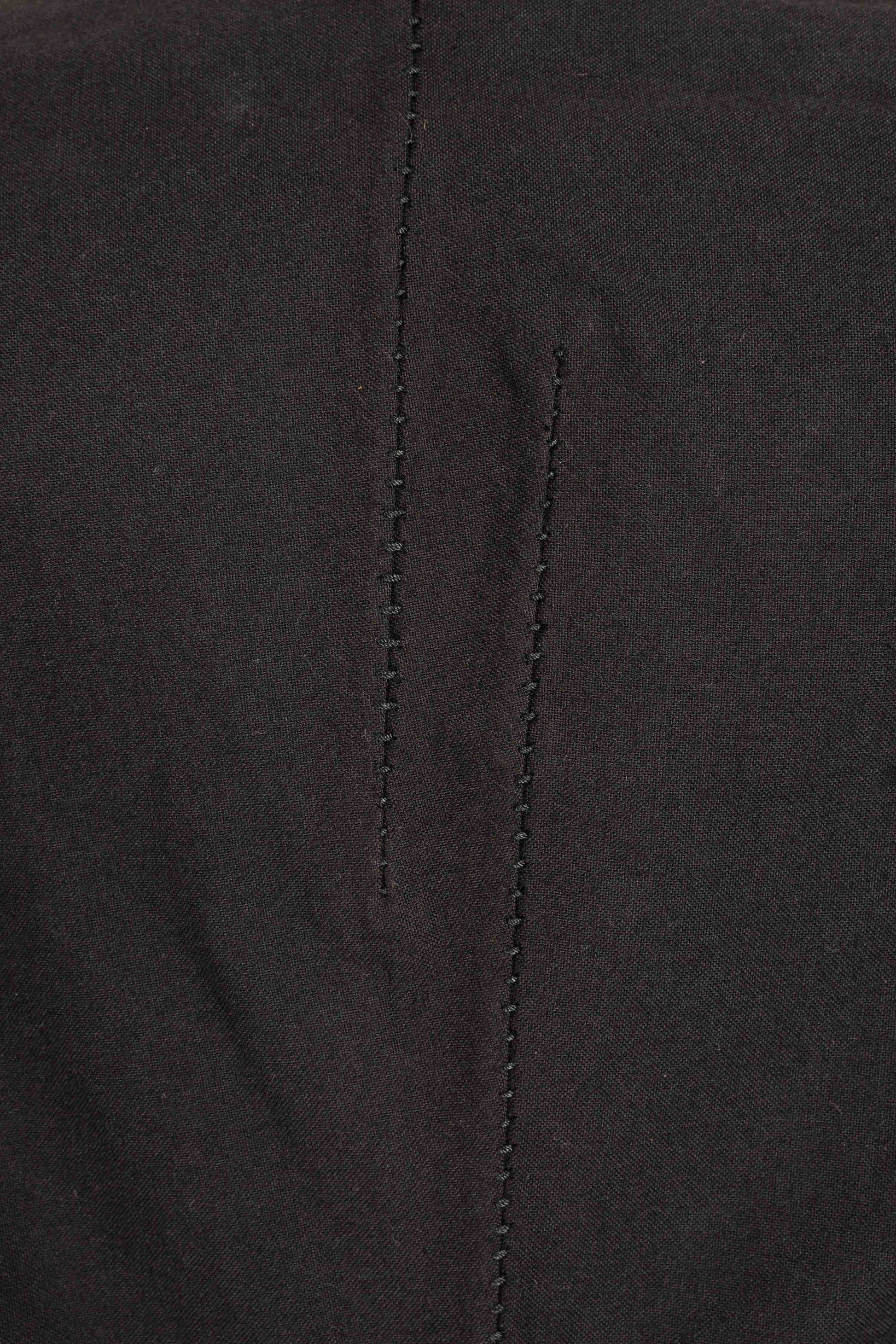 The Visible Meltlock Unlined Back Raglan One-Piece Dead End 1 Button Jacket, model GM/2621, is a testament to avant-garde tailoring. Crafted from a sophisticated blend of cotton and wool, known as LAICO, this black jacket showcases a seamless construction. The garment features a unique raglan sleeve stitched detailing, complemented by a singular button closure and high back vent. The unlined back enhances the lightweight feel of this tailored jacket.